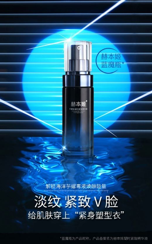 赫本姬藍(lán)魔瓶的出現(xiàn),徹底改變了人們對(duì)精華液浮在臉上、完全不會(huì)吸收、皮膚不透氣的膚感體驗(yàn),為了達(dá)到“肉眼可見(jiàn)”的及時(shí)性改善,藍(lán)魔瓶還引入了緊致界黑馬成分——芋螺毒素肽,擁有強(qiáng)大的塑顏能量,效果媲美傳統(tǒng)肉毒素注射。