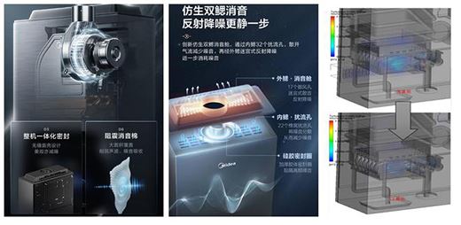 燃氣熱水器噪音自產品誕生以來,一直是用戶的最大痛點之一,目前行業(yè)平均噪音在52-60分貝之間。但是,美的廚熱“燃氣熱水器噪聲控制機理研究及其技術應用”科技項目,通過涵蓋熱交換器、燃燒室、風機與風道機構,以及附屬管路等結構,進行仿真模擬和計算分析,發(fā)現(xiàn)流道阻力隨流量的變化趨勢和聲能傳播損失區(qū)間,原創(chuàng)頂側雙鰓仿生呼吸系統(tǒng),基于內鰓擾流孔及外鰓散風孔設計實現(xiàn)氣流對沖消音。再結合直流變頻系統(tǒng)、航天級吸聲材料和一體化密封機身,將全負荷段噪音直降8分貝,達到45分貝的睡眠級靜音,讓用戶第一次感覺到沐浴可以如此清靜。