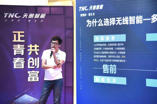 隨后,天朗智能產品經理潘耀彬對《TNC智能家居新品發布》發表演講。本次新品融匯了天朗智能研發團隊的創新成果,由產品部經理潘耀彬與大家分享天朗智能情景開關的結構、外觀、材質、賣點、以及為客戶提供的售前、售中、售后的一系列服務,并現場用手機給大家演示智能燈光的變化過程。來賓們紛紛用筆或手機記錄下產品的最新賣點,以便日后在終端銷售中能第一時間抓住消費者的購買欲。