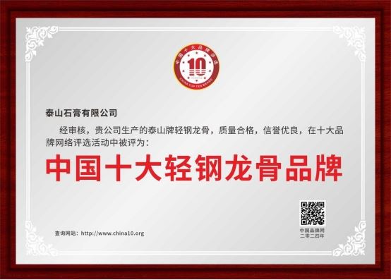 中國十大品牌評選結果于近日重磅發布。經過層層嚴格評審與公開投票,泰山牌輕鋼龍骨榮獲“中國十大輕鋼龍骨品牌”稱號。