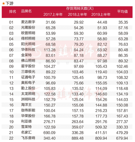 下游照明應用板塊,所選取的22家下游照明應用企業2019上半年平均存貨周轉天數為181.97天,同比去年同期增長9.80%,稍有上升。