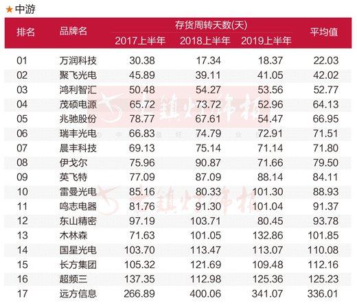 中游封裝板塊,所選取的17家中游封裝企業2019上半年平均存貨周轉天數為95.82天,同比去年同期減少4.43%,庫存壓力有所減緩。其中,萬潤科技得益于“根據訂單組織生產、兼顧市場預測適度庫存”的生產模式自行組織生產,依舊將存貨周轉天數維持在20天左右,位列榜首。