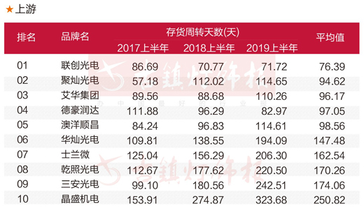 其中,被稱為上游芯片巨頭的三安光電,上半年存貨周轉天數直飚242.51天,三安光電表示,LED芯片競爭激烈,雖然LED芯片銷量相比去年同期保持增長趨勢,但因價格相比去年同期降幅較大,導致公司整體營收和實現的效益相比去年同期有大幅度下降,庫存未能得到有效下降。