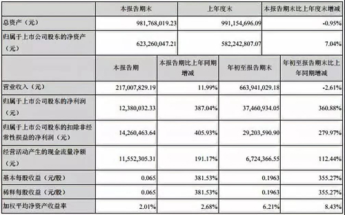 2019年初至報(bào)告期末:營(yíng)業(yè)收入為1,228,633,747.75元,比上年同期增長(zhǎng)4.31%;歸屬于上市公司股東的凈利潤(rùn)為48,428,387.70元,比上年同期增長(zhǎng)520.63%。公告顯示,本報(bào)告期末:總資產(chǎn)為3,623,666,817.65元,比上年度末增長(zhǎng)3.70%。