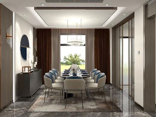 客廳大面積使用大理石材質,時尚又大氣,搭配落地大窗很有高級感,吊頂的設計簡約大方,充足的光源使房間明快敞亮。