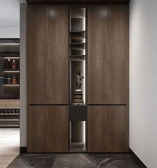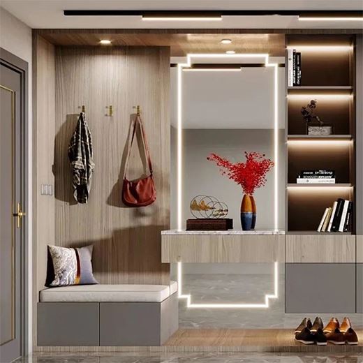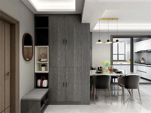 飾品宜精不宜多,由于收納的物品零碎雜亂,在全鋁鞋柜上擺放太多的飾品,很可能取用物品的時候會將飾品打碎;如果是懸掛的物品好于擺件,但有撞頭的可能,建議玄關處的家具或墻壁本身,就兼具裝飾的功能,既節省空間,又俏皮有趣。