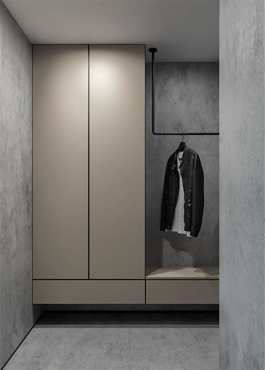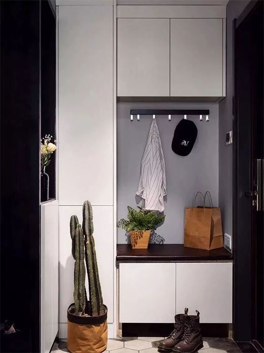 如果家里有老人小孩或者喜歡穿長靴和高跟鞋的女士,設置一個換鞋凳是非常有必要的。沒有換鞋凳,你需要保持金雞獨立的姿勢脫鞋,或者蹲在地上穿鞋。比較聰明的設計是,包含換鞋凳設計的鞋柜可以將凳子部分納入柜體,整體看來更規整,這樣換鞋凳無需額外占用空間,上方空余的空間還可以設置掛衣鉤,下方可以設計成抽屜式儲物或者放置儲物籃,空間利用率更很高。
