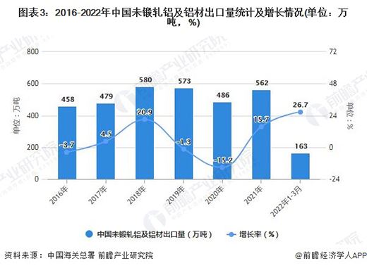 2022年一季度中國未鍛軋鋁及鋁材出口量超過160萬噸