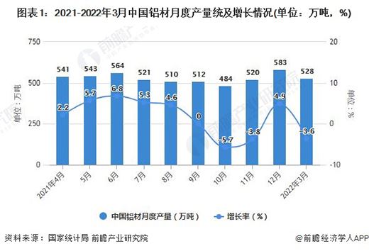 據(jù)國家統(tǒng)計局?jǐn)?shù)據(jù)顯示,2021年全年中國鋁材累計產(chǎn)量達(dá)到了6105.2萬噸,累計增長7.4%。截至2022年3月中國鋁材產(chǎn)量為528萬噸,同比下降3.6%。累計方面,2022年1-3月中國鋁材累計產(chǎn)量達(dá)到1393.7萬噸,累計下降0.5%。