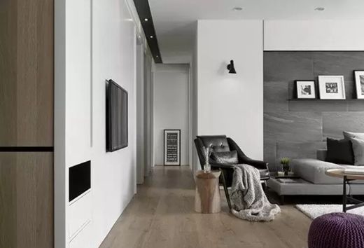 這座公寓位于臺灣新竹,整個空間最大的亮點就是在于對收納空間的規劃,從進門處開始,整面的儲物柜從入口玄關延伸至廚房,客廳,強大的儲物功能讓屋主一家可以將各種大小的雜物全部收納進去,為了避免單調,甚至采用了不同色彩,不同材質的儲物柜。并且用地面材質的不同來劃分區域,輕松帶來層次感。在整體設計上,利用簡約的黑白灰三色進行對比,打造出沉穩又溫馨的生活空間。
