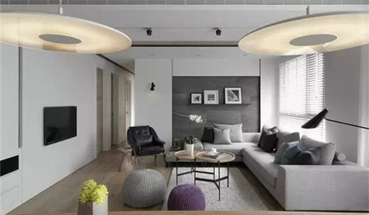 灰色主調的客廳裝飾:灰色的沙發,灰色的背景墻,灰色的地毯,灰色的軟榻;質感與美感交融交錯,充滿了現代簡約的風味。