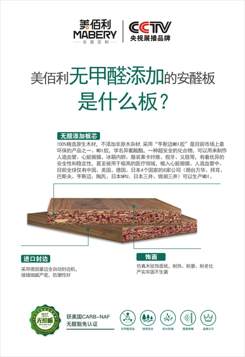 作為“中國十大全屋定制品牌”,美佰利憑借其核心技術,從原材把控,到成品監督一系列流程都實行嚴格管控,做到無醛無苯添加,為行業推出真正的無醛環保板材。未來,美佰利將繼續發揮行業標桿作用,不斷升級板材工藝、提高板材性能、突破環保壁壘,為的就是能夠滿足千萬家庭對健康家居生活的需求,而這就是美佰利“安醛板”誕生的初衷。