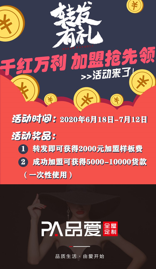 4、轉發即可獲得2000元加盟樣板費,成功加盟可獲得5000-10000元貨款(一次性使用)。