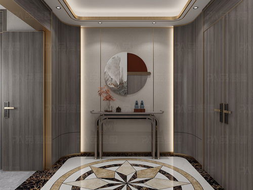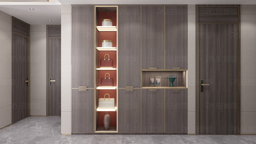“午夢輕回”系列以沉穩(wěn)的高級灰、陽光活潑的香檳色,在入戶兩側(cè)引入深木色的收納柜體,讓整體視覺更富有層次感,質(zhì)感也更為飽滿。