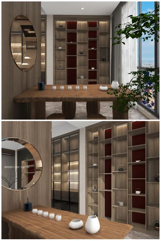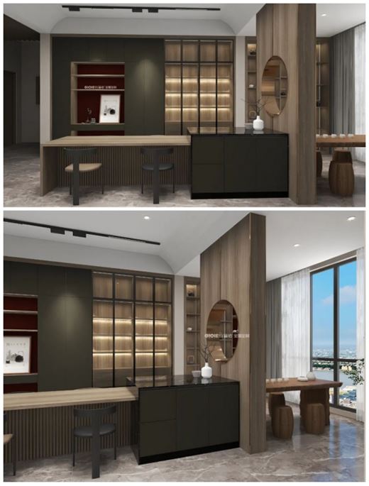 家應該是不斷構建詩意的煙火,餐廳墻面以及廚柜的木飾面,延續新中式的情調,利落的線條增添時尚氣息,賦予現代都市的品質感。