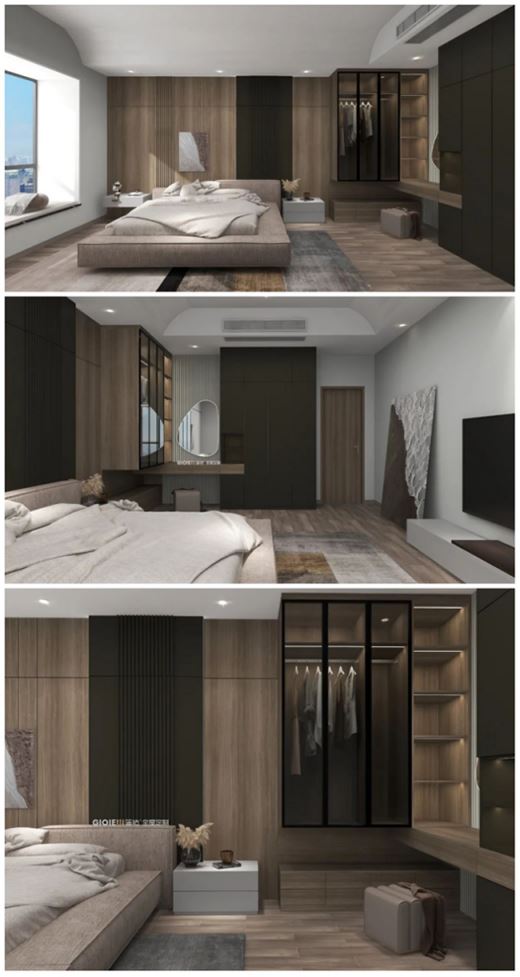 臥室設計師運用利用木色與高級灰的色調,散發的輕松感將一天的疲憊驅散,灰色的家紡增添了室內的安靜感覺。
