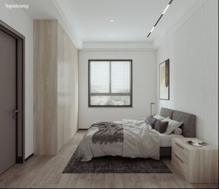 床頭墻掛一幅幾何抽象畫,側(cè)邊木質(zhì)床頭柜,衣柜以原木色柜體,天花裝內(nèi)置小燈,整個(gè)空間顯得簡(jiǎn)約優(yōu)雅而自然。冰川雪瑜花色增加了臥室中的溫軟氣質(zhì),細(xì)節(jié)中展現(xiàn)著生活的小確幸。