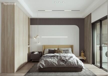 主臥用一抹格柵高級(jí)灰來做床頭點(diǎn)綴,讓空間變得高貴典雅;床邊的吊頂燈個(gè)性又特色,讓這個(gè)極簡(jiǎn)的空間顯得極富特性。一門到頂?shù)臒o把手衣柜,細(xì)密又綿長(zhǎng)的柜體木紋理,簡(jiǎn)單而不簡(jiǎn)陋,精致而不浮夸。