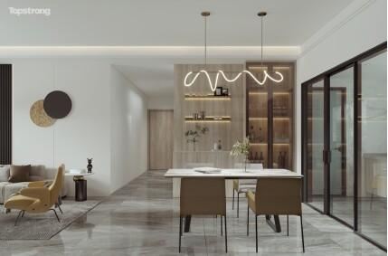 充滿光感的用餐廳與廚房相鄰,貼合墻面的嵌入式餐酒柜,一邊為展示酒格,玻璃掩門再用LED燈加以修飾,十分有格調(diào)。