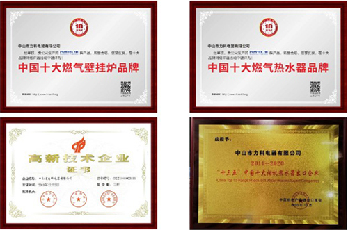 力科榮獲中國品牌網“十大燃氣壁掛爐”和“十大燃氣熱水器”稱號,獲得“高新技術企業”和“中國十大煙機熱水器出口企業”榮譽,產品榮登央視舞臺,與央視CCTV合作。
