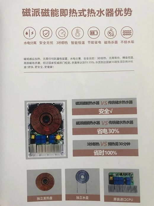 2、節(jié)能性:首先,電磁技術使電流產(chǎn)生高速交變的磁場,產(chǎn)生無數(shù)的小漩渦流,使被加熱的物體自行高速發(fā)熱,從而起到加熱的效果。同時電磁渦流高效集中利用,防止電磁向外輻射泄漏,大大提高了熱效變頻 磁能 熱水器 ---- 讓我們 一起 見證安全 !率,因此,比普通電熱水器節(jié)能、節(jié)電效果十分顯著;其次,獨創(chuàng)的內熱式電磁高頻振蕩設計,使內膽不易結垢,進一步提升節(jié)能效果;能適應寬電壓工作,(120V—275V)快速加熱,電能充分利用。與一