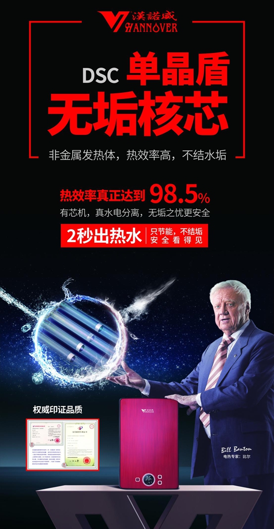 二十年來(lái),漢諾威電器堅(jiān)信“科技鑄就未來(lái)”,因而特別注重以創(chuàng)新技術(shù)實(shí)現(xiàn)產(chǎn)品性能革新,解決行業(yè)痛點(diǎn),為用戶創(chuàng)造更健康的沐浴生活。漢諾威電器集中精力突破行業(yè)技術(shù)難題,用顛覆傳統(tǒng)的“DSC單晶盾”非金屬三超水電分離發(fā)熱技術(shù)改變行業(yè)現(xiàn)狀,滿足消費(fèi)者的健康沐浴需求。