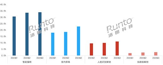 內(nèi)在原因?yàn)槠髽I(yè)以創(chuàng)新為導(dǎo)向,擴(kuò)展產(chǎn)品功能,滿足消費(fèi)者個(gè)性、多樣化需求。洛圖科技(RUNTO)線上數(shù)據(jù)顯示,2022年,智能貓眼功能從年初的30.6%增長(zhǎng)至第三季度的34.0%;在2022年第三季度,配備室內(nèi)屏幕的智能門鎖占據(jù)了22.8%。