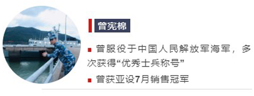 亞設體育的7月銷售冠軍,是“年少有為不自卑”的曾憲棉。他本人曾于中國人民解放軍海軍部隊擔任“潛水艇戰(zhàn)士”,并在服役期間多次獲得“優(yōu)秀士兵”、“優(yōu)秀義務兵”、“優(yōu)秀戰(zhàn)士”等光榮稱號。