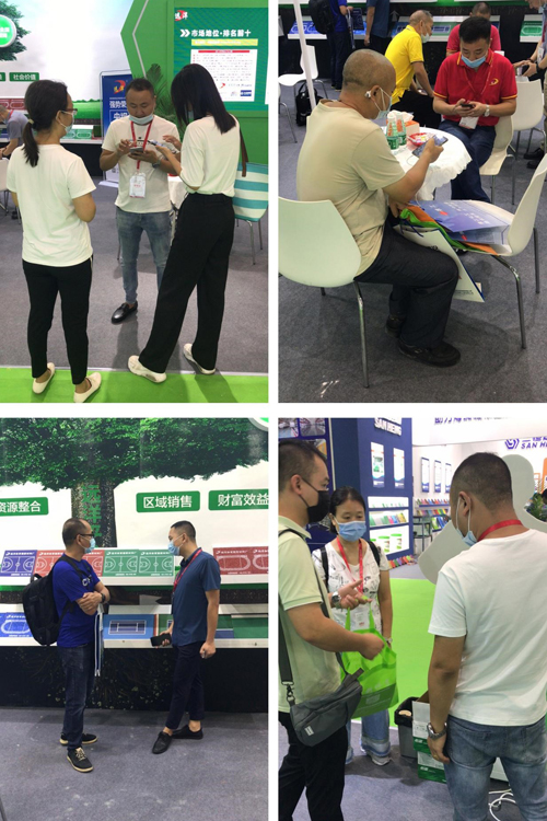 本次遠洋展廳整體主調采用舒適亮眼的綠色,這與品牌所強調的“環保”主題表達一致。展廳內部其中一張宣傳圖上以參天大樹生動表述出“遠洋體育打造環保生態系統”的宏大志向,還有代表著遠洋團隊超強戰斗精神和執行能力的“超人”形象立于入口處,僅憑獨特氣勢展廳效果便賺足了客商的注意力。除此之外,遠洋團隊所提出的5.0商業思維模式及其財富共享平臺更深深打動了來往客商的心。
