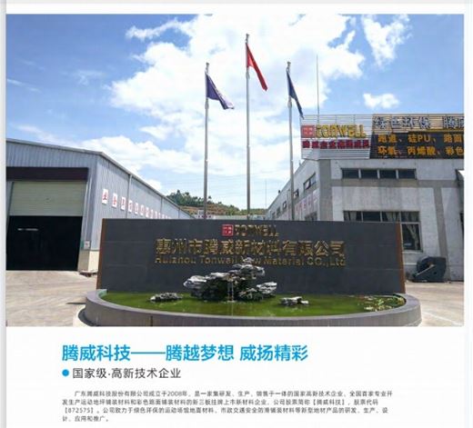 廣東騰威科技股份有限公司成立于2008年,是一家集研發、生產、銷售于一體的國家高新技術企業、全國首家專業開發生產綠色環保的運動場館地面材料、海綿城市及市政路面防滑鋪裝材料、新型商業地坪材料的新三板掛牌上市企業,公司股票簡稱【騰威科技】,股票代碼【872575】。