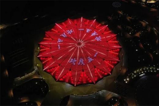夜晚點(diǎn)亮的“石榴花”體育場別具一格。夜景泛光設(shè)計突出表現(xiàn)石榴花綻放的姿態(tài)和絲綢舞動的韻律。靈動的曲面穿孔幕墻與屋面透光陽光板,安裝定制化LED點(diǎn)光源燈具,組成了一個起伏流動的巨型顯示屏,可以播放定制視頻,配合各大節(jié)點(diǎn)呈現(xiàn)出異彩紛呈的視覺效果。航拍下屋面可切換星光與成像兩種模式,帶來震撼超凡的視覺體驗(yàn)。局部立面補(bǔ)充投光燈表現(xiàn)建筑結(jié)構(gòu)的起伏轉(zhuǎn)折。