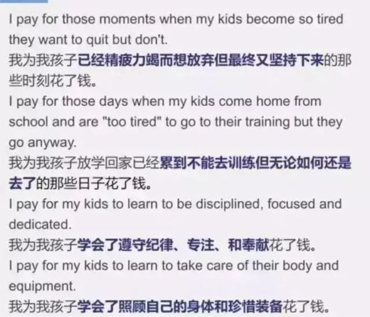 “……我還能說出更多花錢的地方。但是簡而言之,我并沒有為體育花錢,我的錢花在了伴隨體育而來的發展孩子終身受用的品格的機會、給孩子創造贊美他人生命的機會。就目前我所觀察到的,我認為這錢花得相當值!”