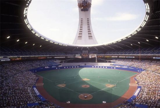 20世紀80年代中期,美國職業(yè)棒球大聯(lián)盟的蒙特利爾博覽會隊在奧林匹克體育場享受清新的空氣,體育場的織物屋頂收縮到毗鄰的塔頂。蒙特利爾博覽會隊于2004年離開蒙特利爾,更名為華盛頓國民隊。攝影:Focus On Sport/Getty Images North America