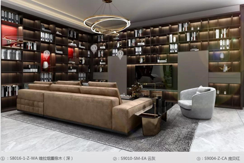 隨著動線向右移動,映入眼前的是輕奢風(fēng)的客廳空間,這個(gè)空間運(yùn)用了大量的維拉煙熏橡木(深),保持整個(gè)設(shè)計(jì)風(fēng)格一致的同時(shí),顏色與之前餐廳有了一個(gè)很好的過度升級。