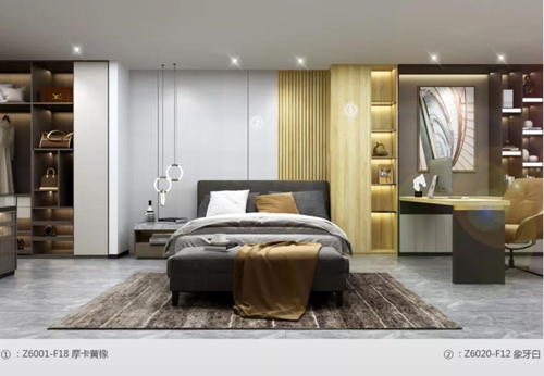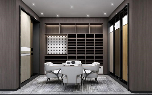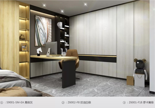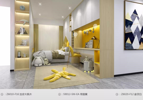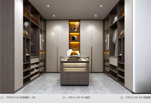 衣帽間的設(shè)計(jì)讓人有一種時(shí)尚就在身邊的感覺。流波暗影(淺)細(xì)膩的紋理,隱約的珠光,讓空間更為靈動,搭配煙灰的門板更突顯時(shí)尚屬性,而帝國黃的跳色更讓整個(gè)衣帽間張揚(yáng)而新潮。