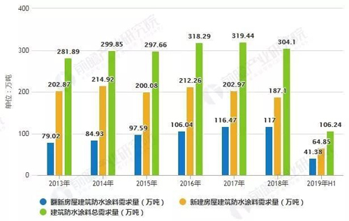 2013-2019H1中國新建房地產(chǎn)防水涂料需求量統(tǒng)計測算情況