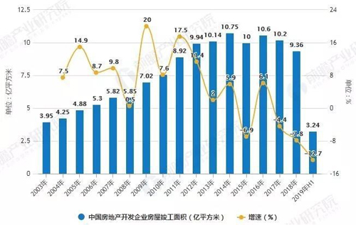 2003-2019年H1中國房地產(chǎn)開發(fā)企業(yè)房屋竣工面積統(tǒng)計及增長情況
