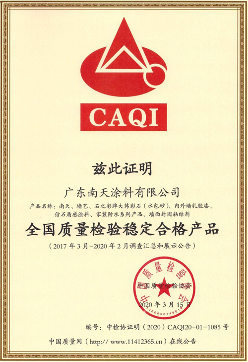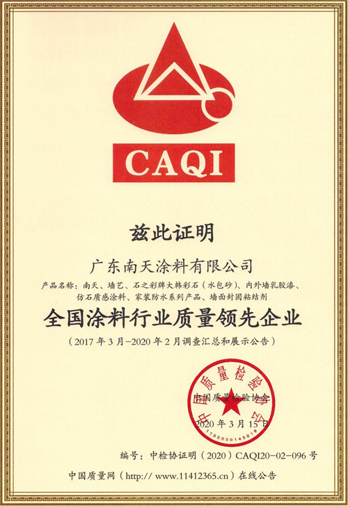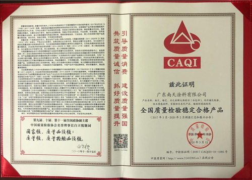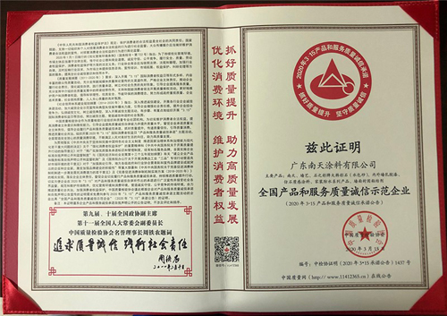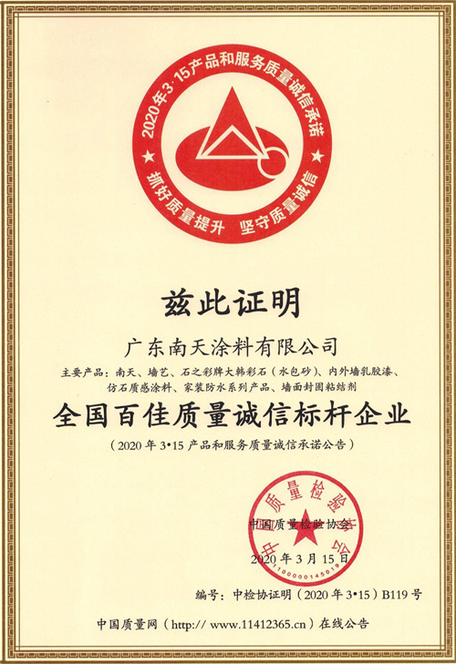 2020年3月15日,在“3.15”國際消費者權益日,廣東南天涂料有限公司憑借可靠的產品質量、完善的售后服務和良好的品牌口碑,一舉斬獲由中國質量檢驗協會頒發的“全國產品和服務質量誠信示范企業”、“全國百佳質量誠信標桿企業”、“全國涂料行業質量信領先企業”、“全國質量檢驗穩定合格產品”等多項榮譽稱號。