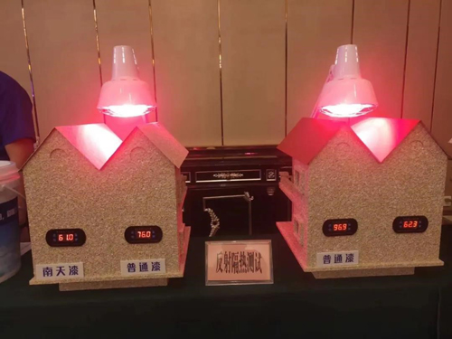 在活動的過程中,南天涂料研發團隊經過多年反復研發、測試,通過國家檢測標準,也獲得國家檢測中心檢測報告。今年推出新產品反射隔熱涂料主要是借助一些對太陽光當中的紅外波段有特殊響應的功能顏填料,能夠對太陽輻射中可見光波段(0.4-0.72μm)和近紅外波段(0.72-2.5μm)部分的能量進行反射反射的節能型功能涂層材料。