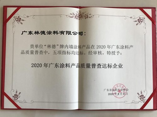 經(jīng)過層層篩選,在此次普查中,林德漆榮獲“2020年廣東涂料產(chǎn)品質(zhì)量普查達(dá)標(biāo)企業(yè)”殊榮,得到了權(quán)威機(jī)構(gòu)對林德漆產(chǎn)品品質(zhì)和服務(wù)的認(rèn)可。