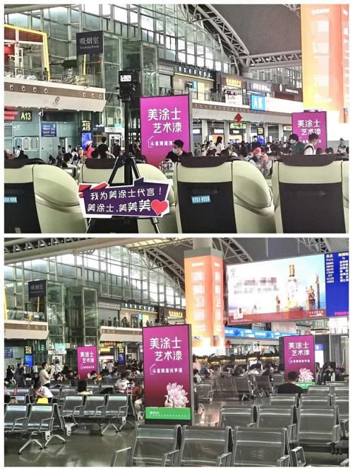 在擁擠又喜悅的五一出游路上,旅客在高鐵站內(nèi)抬頭就能見到美涂士藝術(shù)漆廣告畫面,“綠地紫花”的視覺效果,“美涂士藝術(shù)漆 從底到面抗甲醛”的醒目字樣,以及熟悉的品牌印象,成為高鐵站里一道亮麗的風(fēng)景線!