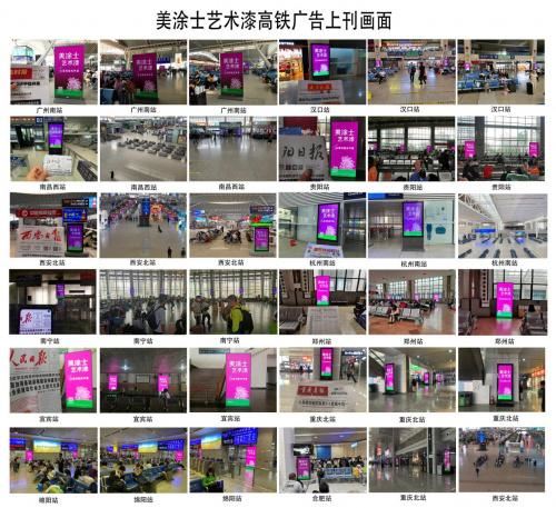 目前,中國高鐵擁有十多億的高鐵旅客。因此高鐵廣告大平臺具備客流量大、傳播速度快、覆蓋范圍廣等眾多優(yōu)勢。此次美涂士與兆訊媒體(中國高鐵媒體第一股)強(qiáng)強(qiáng)聯(lián)手,實力榮登中國高鐵、動車站候車廳,正面?zhèn)鞑?ldquo;美涂士藝術(shù)漆 從底到面抗甲醛”,讓品牌的親和力深入人心,與高鐵乘客進(jìn)行精準(zhǔn)對話,零距離接觸。