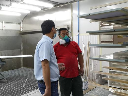 培訓學校老師到涂裝生產線進行詳細的巡線調研工作,除了收集交流課件所需的素材,老師們向科凡的涂裝工友示范標準的操作動作。