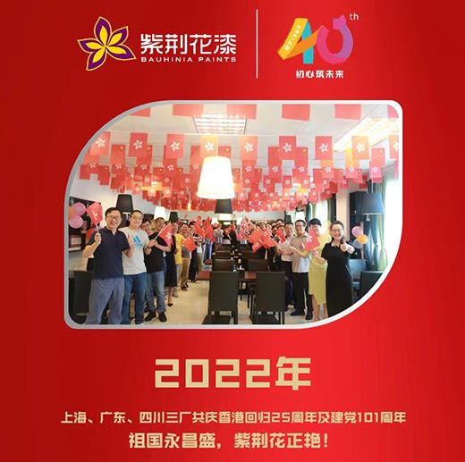2022是香港回歸祖國(guó)的第25周年,恰逢紫荊花涂料成立40周年,紫荊花已對(duì)這片浸灑了親情與生活的熱土產(chǎn)生了深厚的感情,充滿(mǎn)了責(zé)任與使命,成為當(dāng)之無(wú)愧的民族品牌。