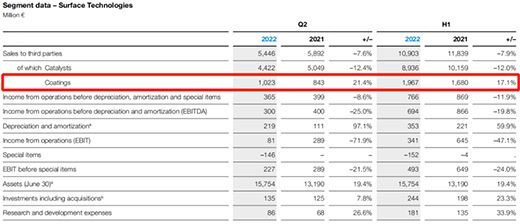 與去年同期相比,表面技術部門的銷售額為54億歐元,同比下降7.6%。涂料部門的可觀銷售增長無法抵消催化劑部門的強勁下滑。同比銷售額下降主要是由于催化劑部門的銷量大幅下降。這主要是由于半導體供應不足和中國的封鎖導致汽車行業(yè)需求疲軟的結果。不計特殊項目的息稅前利潤為2.27億歐元,較2021年第二季度報告的2.89億歐元大幅下降。這是由于涂料部門不計特殊項目的息稅前利潤大幅下降,主要是由于固定成本增加。