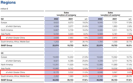 巴斯夫集團2022年第二季度和上半年區(qū)域銷售