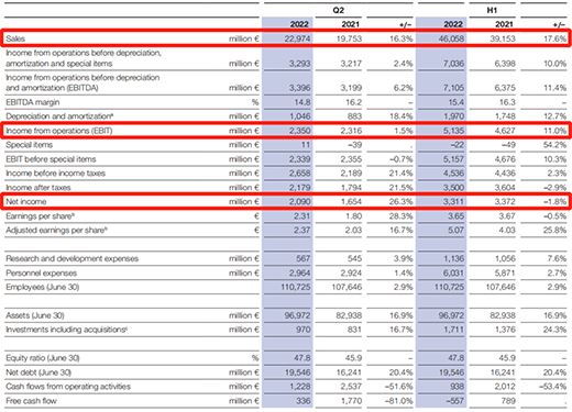 與去年同期相比,材料部門的銷售額大幅增長29.9%,達到49億歐元。這主要是單體部門銷售強勁增長的結果。高性能材料部門也錄得相當大的增長。積極的銷售業(yè)績主要是由于原材料價格上漲導致價格大幅上漲。不計特殊項目的息稅前利潤為6.68億歐元,與2021年第二季度相比大幅下降。在這兩個部門,較高的利潤率無法抵消固定成本的增長。
