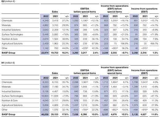 與2021年第二季度相比,化學品部門的銷售額大幅增長27.2%,達到43億歐元。兩個運營部門都對增長做出了貢獻。銷售增長主要是由兩個部門的價格顯著上漲推動的,主要是由于需求持續(xù)強勁,原材料和能源價格上漲。不計特殊項目的息稅前利潤8.53億歐元保持在較高水平,但遠低于去年同期異常強勁的收益。這主要是由于石化部門的收益大幅下降,主要是由于能源價格上漲和貨幣影響導致固定成本增加。