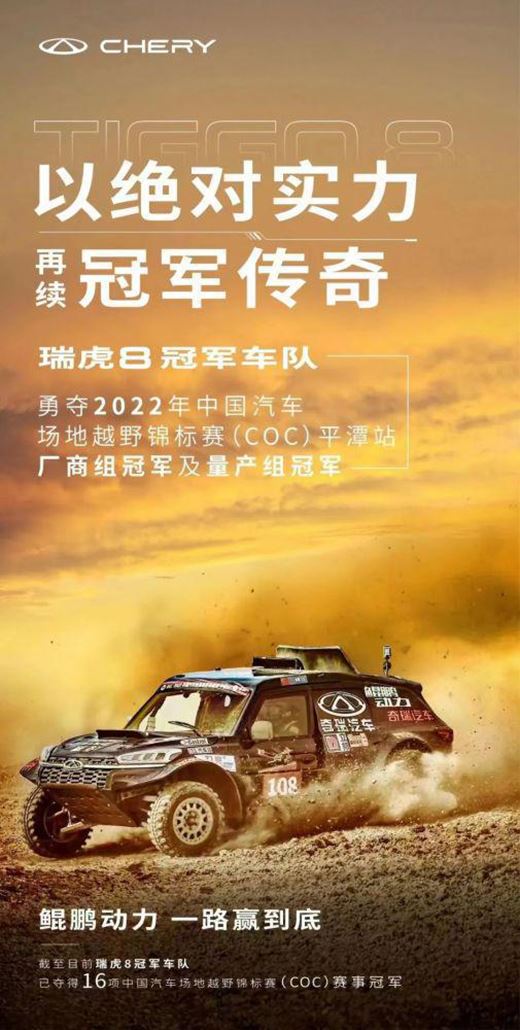 2022中國汽車場地越野錦標賽的賽季首站,于近日在福建平潭落下帷幕。奇瑞瑞虎賽車隊憑借豪華的陣容和優(yōu)異的表現(xiàn),包攬了“量產組”及“廠商組”冠軍。