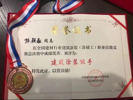 最終,經過兩天的激烈角逐,林德漆麥土德和陳穎磊兩位選手憑借精湛的技術,分別榮獲全國建材行業建筑涂裝職業技能競賽總決賽“建筑涂裝大師”獎和“建筑涂裝能手”獎。